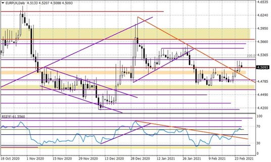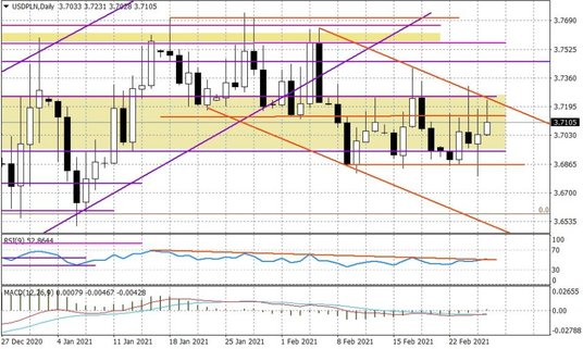 Co dalej? Wczoraj wieczorem mieliśmy wystąpienia kolejnych członków FED (Bostic, Bullard, George), którzy nie wydawali się być nadmiernie przejęci tym co od kilku tygodni dzieje się na rynku długu. Przewijał się wątek prezentowany wcześniej też przez Powella i Claridę, że wzrosty rentowności są czymś naturalnym w obliczu spodziewanego ożywienia gospodarki, ale w opinii FED droga do realizacji celów pozostaje daleka i nie ma powodu do wcześniejszego ogłaszania zmian w polityce monetarnej. W efekcie po wieczornym wyskoku rentowności sytuacja zaczęła się uspokajać, rano dla papierów 10-letnich powróciły one poniżej 1,50 proc. Tym samym o ile jeszcze podczas handlu w Azji było nerwowo, o tyle na otwarciu w Europie widać chęć do kupowania dołków. EURUSD próbuje odbijać od 1,2135, a kontrakty na S&P500 po zejściu w okolice 3800 pkt. wzrosły już o 30 pkt. W efekcie nieśmiało straty próbuje odrabiać też złoty. Zmienność pozostaje jednak duża. Dzisiaj dodatkowo mamy ostatnią sesję miesiąca, co może powodować jakieś księgowe przepływy. Kluczowe będzie to, czy rynek uzna, że wczorajszy wyskok rentowności amerykańskich obligacji mógł jednocześnie sygnalizować przesilenie w trendzie wzrostowym i sytuacja zacznie się stabilizować, czy też problemy dopiero się pojawią rozlewając się na inne klasy aktywów... W przypadku złotego pamiętajmy dodatkowo o dwóch rzeczach - po pierwsze nastawienie wokół rynków EM może być coraz bardziej chwiejne, po drugie sytuacja pandemiczna w Polsce może być coraz mniej stabilna przekładając się na wzrost ryzyka powrotu obostrzeń.