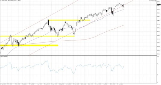 Na początku czwartkowej sesji niemiecki Dax wraca powyżej 14000 pkt., a kontrakt terminowy na S&P500 robi podejście pod szczyt z poprzedniego tygodnia powyżej 3900 pkt. Poniżej 1800 USD za uncję spychane ponownie jest złoto, któremu ciąży obecnie perspektywa zakończenia pandemii i powrotu do normalności. Notowania ropy naftowej poprawiają roczne maksima w czym pomaga niska podaż surowca, przy stopniowo odradzającym się popycie. Wyraźne wzrosty widoczne są w dalszym ciągu w przypadku metali przemysłowych. Miedź dobiła do niewidzianego od dekady poziomu 9500 USD za tonę. We wczorajszych wypowiedziach amerykańskich bankierów centralnych zdecydowanie można było znaleźć jeden mianownik, podkreślający brak jakichkolwiek na obecną chwilę zagrożeń związanych z inflacją. Pomogła też zapowiedź utrzymania do końca roku programu skupu aktywów w obecnym kształcie. Dodatkowo z frontu walki z pandemią napływają kolejne pozytywne sygnały. Badania przeprowadzone na osobach, które przyjęły szczepionkę Pfizera potwierdzają jej skuteczność, co wpisuje się w scenariusz zakończenia pandemii w dalszej części roku.