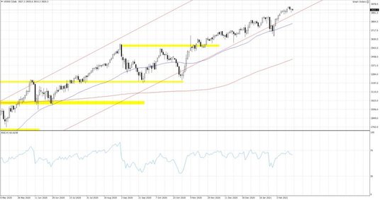 Styczniowe, dużo lepsze od oczekiwań dane o sprzedaży detalicznej i produkcji przemysłowej w USA, były wczoraj mocnym sygnałem o relatywnie dobrej kondycji amerykańskiej gospodarki. Sprzedaż zwiększyła się o 5.3% m/m wobec mediany prognoz na poziomie 1.1%, a produkcja przemysłowa wzrosła o 0.9% m/m, podczas gdy rynek oczekiwał 0.5% m/m. Kondycja konsumentów podobnie jak przemysłu nie pogorszyła się silnie mimo rekordowego poziomu zakażeń na początku roku. Tak dobre dane były oczywiście pozytywnym impulsem na rynku obligacji, ale tam rentowność 10-letnich papierów pozostaje w okolicach odnotowanych w pierwszej połowie tygodnia rocznych maksimów na 1.3%. O ile pozytywny impuls dla dolara był oczywisty, a notowania EURUSD zostały zepchnięte w kierunku 1.20, to już reakcja Wall Street nie była tak jednoznaczna. O ile solidne dane z gospodarki powinny być zachętą do kupowania akcji przez byczo nastawionych inwestorów, to jednak podsycają one oczekiwania na zmianę retoryki ze strony Fed, co widać cały czas po rosnących rentownościach obligacji skarbowych. Wczorajsze minutki ze styczniowego posiedzenia FOMC potwierdziły jednak całkowite wsparcie ze strony amerykańskich bankierów centralnych w odbudowie gospodarczej po przejściu pandemii i brak większych obaw związanych z inflacją. Uwzględniając słabsze od oczekiwań styczniowe dane o dynamice cen w USA, zagrożenie związane z tym, że Fed będzie musiał chłodzić odbicie gospodarcze, wydają się przedwczesne. O ile nie można wykluczać takiego scenariusza w drugiej połowie roku, to jednak w najbliższych tygodniach kolejne gołębie komentarze płynące z Fed powinny przypominać uczestnikom rynku, że polityka monetarna przez długi czas będzie jeszcze wysoce akomodacyjna, co powinno wspierać scenariusz utrzymania trendu wzrostowego na rynku akcyjnym.