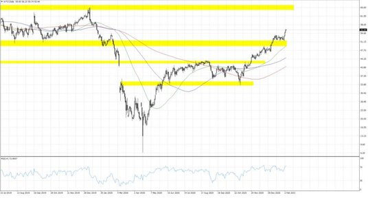 Obecnie kontrakt terminowy na S&P 500 wraca w okolice 3830 pkt., a niemiecki Dax dobija do okrągłego poziomu 14000 pkt. Stopniowo wyczerpujące się paliwo do dalszych wzrostów widać było już w dniu wczorajszym, kiedy sesja na Wall Street zamknęła się tylko minimalnie nad kreską. Niepokój na rynku wzbudziły komentarze przyszłej sekretarz handlu USA Giny Raimondo, która uważa, że nie ma powodów aby wykreślać chińskie firmy z czarnej listy. Uwzględniając jednej perspektywę pakietu fiskalnego w USA, sprawny proces szczepień czy przeważnie lepsze od oczekiwań wyniki amerykańskich spółek, trudno pozostawać niedźwiedzio nastawionym do tamtejszego rynku, szczególnie, że każda przytrafiająca się korekta przez część uczestników wykorzystywana jest do zwiększania swojego zaangażowania. Notowania ropy kreślą natomiast popandemiczne szczyty powyżej 56 USD za baryłkę WTI po tym jak kraje zrzeszone w ramach grupy OPEC+ zakomunikowały, że będą dążyły do szybkiego zniwelowania zapasów ropy powstałych w trakcie pandemii.