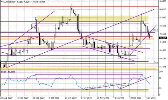 Dla złotego sprawa jest prostsza, gdyż po grudniowej interwencji NBP, polska waluta jest po prostu słaba. To sprawia, że złoty nie ma za bardzo miejsca do większej korekty, nawet gdyby sytuacja na bazowych rynkach miała się pogorszyć. Możemy co najwyżej zobaczyć pauzę w trendzie z ostatnich dni i powrót do niego, przy pierwszej nadarzającej się okazji - taką próbę widać już dzisiaj, choć otwartym pytaniem pozostaje to, czy jutro też pojawi sie większy popyt na złotym.