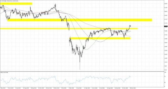 Niemiecki Dax na otwarciu poniedziałkowej sesji chwilowo spadał w kierunku 13200 pkt., niemniej jednak szybko zaczął odrabiać straty. Trudno znaleźć bezpośrednią przyczynę takich ruchów i raczej należy interpretować je jako stabilizację w pobliżu ostatnich szczytów. Co prawda pojawiły się informacje, że USA planują dodać kolejne 4 firmy na czarną listę, ale pamiętajmy, że rynek akcji w listopadzie zaliczył dwucyfrowy wzrost po informacjach o owocnych pracach nad szczepionką i doniesienia o ponownej eskalacji konfliktu handlowego nie powinny mieć większego znaczenia. Pierwsze szczepienia w USA mają się rozpocząć już w przyszłym tygodniu. W przypadku powodzenia daje to szansę na powrót do normalności w perspektywie 2021 r. i przejście do fazy zdecydowanego ożywienia koniunktury. Opublikowane dziś listopadowe dane z Chin wpisują się w obraz postępującej odbudowy gospodarczej. Wskaźnik dla przemysłu wzrósł do 56.4 pkt. z 56.2 pkt., a dla sektora usługowego do 52.1 pkt. z 51.4 pkt. odnotowanych w październiku. Na rynku ropy naftowej obserwujemy spadek poniżej 45 USD za baryłkę WTI po tym jak producenci OPEC nie doszli jeszcze do porozumienia w sprawie przedłużenia obecnych limitów na pierwsze miesiące 2021. Dziś rozpoczyna się szczyt producentów ropy i - jeśli kraje nie dojdą do konsensusu - od początku przyszłego roku wydobycie wzrośnie o 1.9 mln baryłek dziennie, co zaciążyłoby na notowaniach czarnego złota.