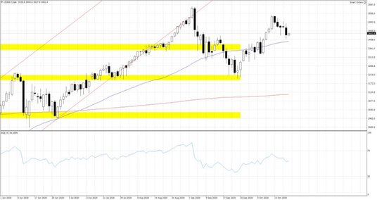 Sesja na Starym Kontynencie rozpoczyna się w kolorze zielonym, a niemiecki Dax wraca w okolice 12800 pkt. O ile wczoraj rynek przestraszył się rozwoju pandemii na świecie, to jednak w dziś mija deadline na porozumienia fiskalne w USA i cześć inwestorów liczy na zawarcie kompromisu rzutem na taśmę, aby jeszcze przyjąć je przed wyborami. Nadzieje na finał rozmów zostały wsparte komentarzami spikera Izby Reprezentantów Nancy Pelosi, która oświadczyła, że różnice pomiędzy propozycją Demokratów, a Republikanów zawężają się. O ile potencjalnie porozumienie może przynieść krótkotrwałą poprawę nastrojów, to jednak ryzyka z związane z Covid-19 się utrzymują. Liczba nowych przypadków na świecie jest rekordowa, co w największym stopniu wynika ze wzrostu zakażeń w Europie. W USA ponownie liczba nowych chorych powoli dobija do 60 tys. dziennie, czyli zbliżamy się do sierpniowych rekordów. O ile prze wyborami w USA nie ma co liczyć na silniejsze obostrzenia, to w Europie takiego scenariusza nie można wykluczać. W dniu wczorajszym na 6-tygodniowy lockdown zdecydowała się Irlandia. Otwarte pozostały jedynie sklepy spożywcze, a mieszkańcy nie powinni oddalać się od swojego miejsca zamieszkania. Na niewielką skalę jest już zatem powtórka kwietniowej rzeczywistości. Wizja wprowadzenia takich ograniczeń w szerszej skali powinna ograniczać przestrzeń do wzrostów bardziej ryzykownych aktywów. Dodatkowo możliwość wydłużenia okresu obostrzeń na cały sezon grypowy jesienno-zimowy również nie powinno napawać optymizmem.