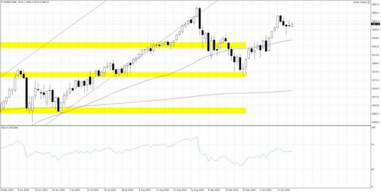 Choć liczba nowych przypadków Covid-19 jest rekordowa, a kolejne rządy - aby ograniczyć rozprzestrzenianie się wirusa - mogą coraz mocniej dławić aktywność, to notowania kontraktów terminowych na amerykańskie indeksy w poniedziałkowy poranek próbują dalej piąć się na północ. Wszystko w efekcie postępu negocjacji dotyczących czwartej fazy luzowania fiskalnego w USA. Spiker Izby Reprezentantów Nancy Pelosi oświadczyła, że widzi poprawę w rozmowach i narzuciła wtorkowy deadline, jeśli pakiet miałby wejść w życie jeszcze przed wyborami. Opublikowane dziś dane z Chin za III kw. wypadły słabiej od prognoz, a wzrost wyniósł 4.9% r/r wobec mediany prognoz na poziomie 5.2% r/r i 3.2% r/r odnotowanych w II kw. Lepsze od oczekiwań okazały się za to wrześniowe odczyty sprzedaży detalicznej i produkcji przemysłowej, wpisując się w scenariusz odbicia aktywności gospodarczej po najsilniejszym uderzeniu pandemii w Chinach na początku roku. Na początku sesji na Starym Kontynencie niemiecki Dax wychodzi powyżej 13000 pkt., a notowania kontraktu terminowego na S&P 500 dobijają do 3500 pkt.