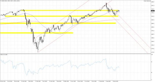 Dodatkowo wezwał on ze szpitala do zawarcia porozumienia w sprawie czwartej fazy luzowania fiskalnego, gdzie Republikanie z Demokratami prowadzą zażarte targi. Jeszcze w piątek Nancy Pelosi w optymistycznym tonie wypowiadała się na temat możliwości zawarcia kompromisu. Podkreślała, że rozmowy toczą się w przyjaznym tonie i zmierzają w dobrym kierunku. Trump szpital może opuścić już w dniu dzisiejszym, co wspiera scenariusz kontunuowania kampanii prezydenckiej. W poniedziałkowy poranek główne indeksy próbują wymazywać piątkowe spadki, a notowania kontraktu terminowego na S&P 500 wracają w okolice 3360 pkt. Jeśli chodzi o front walki z pandemią, to brak pozytywnych wieści, szczególnie w Europie, gdzie Paryż planuje częściowe przywracanie restrykcji. Dziś w kalendarium makroekonomicznym należy zwrócić uwagę na usługowe wskaźniki koniunktury za wrzesień, szczególnie z USA. Publikowane przed południem dane ze strefy euro potwierdzają spowolnienie aktywności, pytanie jednak jak prezentuje się sytuacja w USA. Mediana prognoz rynkowych w przypadku danych ISM zakłada nieznaczne osunięcie się wskaźnika do 56.2 pkt. z 56.9 pkt. poprzednio.
