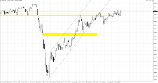 Niemiecki Dax zaliczył w dniu wczorajszym zwyżki w podobnej skali, niemniej jednak wystarczyło mu to do wyjścia na tygodniowe maksima. Na początku czwartkowych godzin handlu notowania znajdują się w okolicach 13200 pkt. i niewiele brakowało im do wybicia się na nowe popandemiczne szczyty. Potencjalny impuls to tego może pojawić się w dniu dzisiejszym ze strony EBC, jeśli Rada Prezesów zdecydowałaby się mocniej uderzyć w gołębie tony, chcąc zapewnić gospodarcze jak najbardziej akomodacyjne warunki do odbudowy gospodarczej po największym zagrożeniu związanym z pandemią. EBC przedstawi dziś najnowsze projekcje makroekonomiczne ale Christine Lagarde na konferencji po posiedzeniu będzie zapewne mocno podkreślać, że dalsze perspektywy gospodarcze uzależnione będą wyłącznie od rozwoju sytuacji związanej z pandemią. Elementem zaskoczenia może być też potencjalny komentarz dotyczący ostatnich wzrostów notowań wspólnej waluty. Nie należy zapominać jednak, że dla ogólnego sentymentu w dalszym ciągu kluczowe będzie podejście inwestorów do spółek technologicznych.
