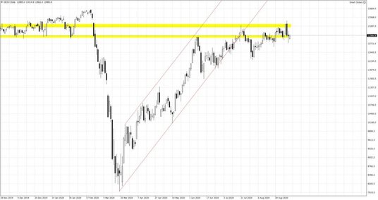 Dzisiejsze kalendarium nie należy do najciekawszych i zapewne nie zmieni sytuacji rynkowej. Na uwagę zasługuje jedynie publikowany przed południem wskaźnik Sentix, odzwierciedlający poziom koniunktury w Eurolandzie we wrześniu widziany oczami specjalistów w branży finansowej. Niepewność wspierana jest również przez administrację rządową USA, która to przekazała w komunikacie informacje o rozważanym nałożeniu dodatkowych sankcji na chińską firmę Semiconductor Manufacturing International Corp (SMIC). Możliwe jest nałożenie na kluczowego producenta podzespołów elektronicznych dodatkowych obostrzeń na wzór tych, które zastosowane zostały wobec chińskiego giganta Huawei. Notowania kontraktu terminowego po piątkowym zejściu do poziomu 3350 pkt. wracają dziś powyżej 3400. Niemiecki Dax dobija natomiast do okolic 13000 pkt., a sesja na Starym Kontynencie rozpoczyna się od ok. 1% odreagowania ubiegłotygodniowych spadków. Dzisiejsze święto w USA i niższa płynność nie powinna zachęcać jednak do większych przetasowań na rynkach. Na odpowiedź na pytanie czy ubiegłotygodniowe spadki były lekką zadyszką w trendzie wzrostowym, czy początkiem większego cofnięcia przyjdzie poczekać nam przynajmniej do jutra.
