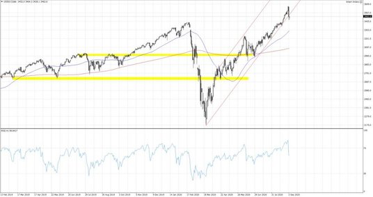 Na rynku nie pojawił się bezpośredni katalizator wyprzedaży, co wpisuje się w korekcyjny scenariusz. Opublikowane w dniu wczorajszym dane z amerykańskiej gospodarki okazały się całkiem przyzwoite. Indeks ISM dla sektora usługowego w sierpniu zgodnie z oczekiwaniami obniżył się do 56.9 pkt. z 58.1 pkt. odnotowanych w lipcu, a indeks PMI wzrósł do 55.0 pkt. z 50.0 pkt. miesiąc wcześniej. Liczba cotygodniowych wniosków o zasiłek dla bezrobotnych okazała się niższa od prognoz i wyniosła 881 tys. Dziś jednak przed nami najważniejsza publikacja jaką jest comiesięczny raport z rynku pracy. Zmiana zatrudnienia jest obecnie dość trudno prognozowalna, co potwierdziły spore odchylenia od oczekiwań w przypadku raportu ADP jaki poznaliśmy w środę. Wskazał on na odtworzenie w sierpniu zaledwie 428 tys. miejsc pracy. Mediana prognoz rynkowych wobec dzisiejszego odczytu zawieszona jest milion wyżej. Wobec stopy bezrobocia rynek spodziewa się spadku wskaźnika do 9.8% z 10.2% miesiąc wcześniej. Doszukując się przyczyn pogorszenia sentymentu wobec spółek technologicznych należy zwrócić uwagę na wysoki poziom wycen. Tesla w tym tygodniu poinformowała o sprzedaży akcji w celu pozyskania kapitału na inwestycje. Pytanie jednak czy wczorajsza przecena była tylko lekką zadyszką w rajdzie na północ czy zaczątkiem większej korekty. Jak na razie nie można wykluczać scenariusza podkupowania dołków. Dla oceny tego kluczowa powinna być dzisiejsza sesja. Z rynkowego punktu widzenia niewiele się zmieniło. Prace nad szczepionką, która ma zmienić układ sił w walce z pandemią, wciąż trwają pełną parą, a zarówno banki centralne jak i poszczególne rządy nie poprzestaną w pobudzaniu gospodarki. 5% przecena spółek technologicznych może okazać się czynnikiem wystarczającym do tego, aby część inwestorów zdecydowała się wskoczyć do pędzącego pociągu.