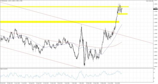 Podobnie wygląda sytuacja również w dniu dzisiejszym. W USA negocjacje nad czwartą fazą luzowania fiskalnego trwają, a w weekend będą prowadzone rozmowy dotyczące wykonania pierwszej fazy porozumienia handlowego pomiędzy USA a Chinami. O ile końcówka tygodnia wygląda spokojnie, to jednak poniedziałkowe otwarcie na rynkach może przynieść większą zmienność w przypadku wyklarowania się powyższych kwestii. Lipcowe dane o produkcji przemysłowej i sprzedaży detalicznej w Chinach tym razem okazały się nieco słabsze od oczekiwań. Produkcja zwiększyła się o 4.8% r/r czyli identycznie jak w czerwcu, podczas gdy sprzedaż spadła o 1.1% r/r po spadku o 1.8% r/r w czerwcu. Dziś przed otwarciem sesji na Wall Street opublikowane zostaną analogiczne wskaźniki z USA, a o godzinie 16:00 wstępny sierpniowy raport Uniwersytetu Michigan odzwierciedlający nastroje amerykańskich gospodarstw domowych. Wczorajsze tygodniowe dane z rynku pracy przyniosły pozytywną niespodziankę, a liczba nowych wniosków o zasiłek dla bezrobotnych spadła poniżej miliona po raz pierwszy od marca. Piątkowy poranek na rynku walutowym nie przynosi większych zmian, a kurs EURUSD pozostaje dokładnie pośrodku trwającej od dwóch tygodni konsolidacji w przedziale 1.17-1.19. O ile liczba nowych przypadków Covid-19 w USA przestała rosnąć, to jednak w Europie sytuacja zaczyna się pogarszać. W Niemczech ilość nowo zarażonych jest najwyższa od 3 miesięcy. Statystyki podobnie pogarszają się we Francji czy Hiszpanii.