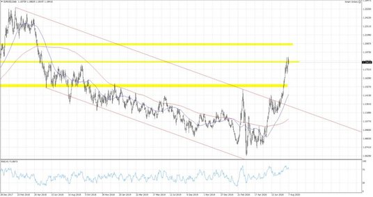 Mediana prognoz rynkowych w przypadku zatrudnienia w sektorze pozarolniczym wskazuje na wzrost ilości nowych etatów o ok 1.5 mln po 4.8 mln nowych miejsc pracy przywróconych w czerwcu. Dzisiejsze dane obarczone są jednak sporym ryzykiem. Jerome Powell na konferencji prasowej po ostatnim posiedzeniu Fed mówił już, że dynamika zmian na rynku pracy jest obecnie bardzo trudno prognozowalna. Opublikowany dwa dni wcześniej raport ADP wskazał na wzrost ilości nowych etatów tylko o 167 tys., a subindeks usługowego wskaźnika ISM obniżył się do 42.1 pkt. z 43.1 pkt. w czerwcu sugerując zmniejszenie liczby etatów. Rozczarowanie w dzisiejszych danych mogłoby więc ponownie zwiększyć presję na dolara i wydźwignąć kurs EURUSD powyżej 1.19. Obecnie wraz z pogorszeniem sentymentu amerykańska waluta odrabia cześć strat.