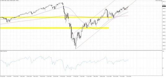 Sentyment na rynkach finansowych pozostaje bardzo dobry, co jest jeszcze wynikiem lepszych od oczekiwań wyników spółek technologicznych w USA z ubiegłego tygodnia za II kw. oraz wczorajszego wydźwięku danych PMI. Co najważniejsze nie tylko w strefie euro ale i w USA tempo poprawy koniunktury przyspiesza mimo, szerzącej się epidemii. Wskaźnik ISM wzrósł w ubiegłym miesiącu do 54.2 pkt. z 52.6 pkt. odnotowanych w czerwcu, co jest najwyższym odczytem od marca 2019. Jeśli chodzi o spółki technologiczne to pozytywny wydźwięk sezonu wyników sprzyja rysowaniu nowych szczytów wszechczasów w przypadku Nasdaqa. Popyt na ryzyko wsparły również informacje płynące z Białego Domu dotyczące badania możliwości prawnych związanych z wydłużeniem wygasającego finansowego wsparcia dla bezrobotnych. Dodatkowo liczba nowych przypadków Covid-19 nieco się zmniejsza. W centrum uwagi rynków w najbliższym czasie znajdować się będą toczące się rozmowy związane z kolejnym pakietem fiskalnym oraz utrzymujące się na podwyższonym poziomie napięcia w amerykańsko-chińskich relacjach. Obydwa elementy mają duży potencjał to tego aby wprowadzić zamieszanie na rynku.