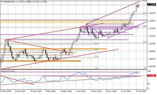 Notowania EURUSD powróciły dzisiaj rano w okolice maksimów z tego tygodnia (1,1770-80). W przypadku ich naruszenia mocnym oporem może być górne ograniczenie hipotetycznego kanału wzrostowego, które przebiega wokół 1,1815. Jednocześnie na dziennym RSI9 mielibyśmy już widoczną dywergencję, co tylko zwiększałoby prawdopodobieństwo wejścia w korektę.