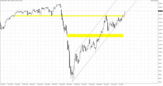 Przemawiają za tym kolejne doniesienia związane z owocnymi pracami nad szczepioną na Covid-19 oraz uzyskanie porozumienia dotyczącego planu odbudowy dla Unii i przyszłej perspektywy budżetowej. Na początku wtorkowej sesji niemiecki Dax wychodzi powyżej 13200 pkt., co jest najwyższym poziomem od końca lutego, kiedy koronawirus zaczął być problemem Europy. Kontrakt terminowy na S&P 500 natomiast dalej pnie się na północ powyżej 3200 pkt. O ile w jego przypadku wczorajsza sesja zakończyła się niespełna jednoprocentową zwyżką, to już Nasdaq zwyżkował o prawie 3%. W kierunku technologicznych spółek kapitał cały czas napływa szeroki strumieniem, bowiem w czasach pandemii to one mają sobie radzić relatywnie lepiej niż tradycyjne sektory, a ogrom kapitału dostępny na rynku musi gdzieś znaleźć ujście. W tym tygodniu poznamy wyniki takich gigantów jak Microsoft czy Intel, które pokażą czy spółki te faktycznie radziły sobie tak dobrze w II kw. Część inwestorów będzie więc mogła powiedzieć sprawdzam. Jeśli wyniki przebiją oczekiwania rynkowe, hossa będzie trwała dalej, jeśli nie, będzie to argument do realizacji zysków.