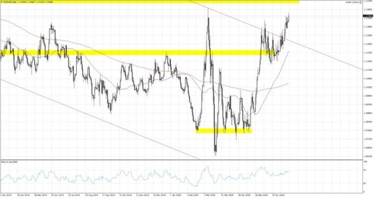 Negocjacje obecnie toczą się o wielkość bezzwrotnych grantów, bowiem co do wielkości programu jest już zgoda na 750 mld euro. Najbardziej dotknięte pandemią Włochy oraz Hiszpania wspierane przez Francję i Niemcy dążą aby kwota bezzwrotnych funduszy wynosiła więcej niż 400 mld euro podczas gdy Holandia, Austria, Dania, Szwecja i Finlandia zgadzają się jedynie na 350. Dziś rano negocjacje zostały przerwane i mają ruszyć o godzinie 16:00. Na agendzie pojawiła się nowa propozycja 390 mld euro. Tak długo przeciągające się rozmowy dają nadzieję, że uda się uzyskać kompromis i w efekcie notowania wspólnej waluty dobijają do marcowych maksimów w okolicach 1.15. Determinacja w prowadzonych rozmowach jest dowodem chęci uzyskania porozumienia. Poprawę sentymentu w regionie obrazuje również zawężający się spread pomiędzy rentownościami niemieckich bundów, a włoskimi papierami. Uzyskanie kompromisu będzie więc czynnikiem oddziałującym w kierunku dalszej aprecjacji notowań wspólnej waluty. Mimo mieszanych nastrojów na rynku akcyjnym sentyment wobec dolara pozostaje nienajlepszy, co dodatkowo powinno sprzyjać notowaniom głównej pary walutowej.