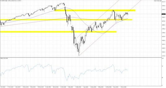 O ile wczorajsza sesja na Wall Street miała mieszany przebieg, Nasdaq znalazł się na nowych szczytach podczas gdy przemysłowy Dow Jones stracił przeszło 1%, to dziś już notowania na wszystkie amerykańskie indeksy znajdują się pod kreską. Podczas otwarcia handlu na Starym Kontynencie niemiecki Dax spada na tygodniowe minima poniżej 12500 pkt., a pierwsze wsparcia notowania mogą znaleźć w okolicy 11800 pkt. W momencie gdy krzywa nowych zachorowań jest wznosząca, inwestorzy przed weekendem, w obawie przed możliwością pojawienia się luk spadkowych na otwarciu nowego tygodnia mogą się wyzbywać ryzykownych aktywów. Hong Kong ponownie zamyka szkoły, a Australia wprowadzenie dodatkowe obostrzenia jeśli chodzi o podróżowanie.