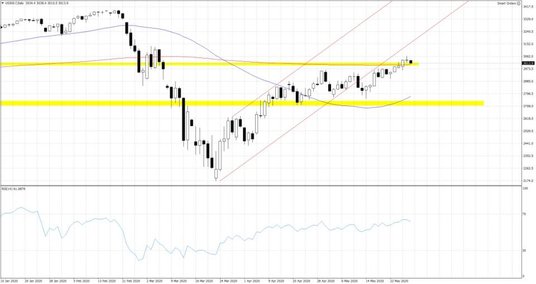 Indeksy w dalszym ciągu pozostają w okolicy 12-tygodniowych maksimów, niemniej jednak dzisiejsza sesja zapowiada się ciekawie. Kontrakt terminowy na S&P pozostaje powyżej 3000 pkt. a niemiecki Dax notowany jest na poziomie 11600 pkt. O sankcjach na część przedstawicieli chińskich po działaniach podjętych wobec Hong Kongu mówi się już od tygodnia. W przypadku takiego rozwoju wydarzeń strona Chińska zapewne nie zostanie dłużna i w trakcie weekendu można by spodziewać się analogicznej odpowiedzi, co potencjalnie może wiązać się ze wzrostem zmienności na początku nowego tygodnia. W ostatnich tygodniach rynek cieszył się z odmrażania gospodarek, które w dużej mierze już się dokonało i obecnie trzeba będzie zmierzyć się z nowymi warunkami prowadzenia biznesu w czasach pandemii. Stan realnej gospodarki pozostaje zły i istnieje ogromna niepewność jak dynamiczne będzie odbicie. Dodatkowo ryzyko eskalacji napięcia pomiędzy USA a Chinami pozostaje znaczne i stanowi obecnie największe zagrożenie dla rynków.