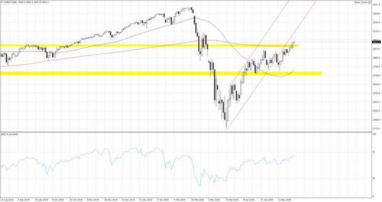 Odbicie cen akcji trwa, wraz z tym jak odbudowywana jest aktywność, przy czym nie widać dramatycznego pogorszenia sytuacji epidemiologicznej po poluzowaniu obostrzeń. Pozwala to z nadzieją patrzeć w przyszłość. Z fundamentalnego punktu widzenia nic się nie zmienia. Odbudowywanie aktywności przemawia za powrotem indeksów na szczyt, a ogrom pieniądza wpompowany w gospodarkę sprawia, że szybciej wrócą one do punktu wyjścia niż realna gospodarka. Czynnikiem ryzyka pozostaje Donald Trump i jego wybuchowa natura, która w relacjach z Chinami stanowi spore zagrożenie. Przez pandemię koronawirusa ryzyko ponownego rozniecenia konfliktu handlowego pozostaje duże. Nie najlepiej wróży rozwój wydarzeń związanych z nałożeniem przez Chiny nowych zasad bezpieczeństwa w Hong Kongu. USA nie określają już tego obszaru jako autonomicznego, co może wiązać się z sankcjami i podniesieniem taryf. Dużo gorzej w porównaniu do innych indeksów radził sobie wczoraj technologiczny Nasdaq po doniesieniach sugerujących, że administracja Trumpa planuje podjęcie działań wobec gigantów technologicznych za moderowanie treści na ich stronach.