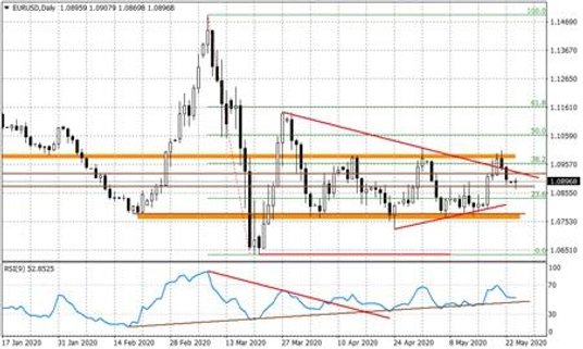 W gronie nieco słabszych walut jest dzisiaj też euro i tutaj sytuacja może być w najbliższych dniach dynamiczna. Do środy Komisja Europejska powinna zaprezentować szczegóły nowego planu pomocowego, który ponad tydzień temu został wstępnie uzgodniony przez Francję i Niemcy. Tymczasem według doniesień kilka krajów wyraża swój stanowczy sprzeciw, co do jego formuły (miałby być finansowany emisją wspólnego długu) – są to Austria, Dania, Holandia i Szwecja. Najbliższe dni pokażą na ile jest to jakaś forma dyplomatycznej gry mającej zaznaczyć o swojej pozycji, a na ile skuteczne veto blokujące ten projekt na dłużej. W skrócie – im więcej politycznych przepychanek, tym gorzej dla euro.