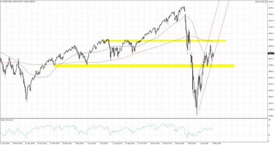 Notowania GBPUSD podchodzą bowiem pod 1.24. Szef Banku Anglii Andrew Bailey podkreślił jednak, że BoE gotowy jest działać jeśli warunki gospodarcze ulegną dalszemu pogorszeniu. Głosowanie w kwestii zwiększenia programu luzowania ilościowego zakończyło się 7-2, a Haskel i Saunders postulowali za zwiększeniem skali skupu aktywów o 100 mld GBP. Zmienność na rynku walutowym pozostaje jednak ograniczona. Kurs EURUSD utrzymuje się tuż poniżej granicy 1.08, a notowania USDJPY odbijają od 106, czyli minimów z połowy marca, gdzie znalazły się w dniu wczorajszym wraz z tym jak pogorszył się nieco sentyment rynkowy. S&P 500 środową sesję zakończył pod kreską, niemniej jednak technologiczny Nasdaq dalej piął się na północ w kierunku 9000 pkt. Duża część uczestników rynku uważa, że nawet w środowisku globalnej pandemii dobrze będą sobie radziły takie spółki jak Apple czy Microsoft. Z początkiem dzisiejszego handlu optymizm powraca na rynki, a kontrakt terminowy na S&P rusza w kierunku wczorajszych maksimów. Niemiecki Dax również próbuje podejścia pod 10700 pkt. Rynek wciąż żyje perspektywami odmrażania gospodarki, a Donald Trump jak na razie powstrzymuje się od kolejnych oskarżeń kierowanych pod chińskim adresem, co powinno przemawiać za kontynuacją wzrostów. Dziś dodatkowo pozytywnie zaskoczyły dane o wzroście chińskiego eksportu w kwietniu o 3.5% r/r podczas gdy rynek spodziewał się spadku o 12.1% r/r. Import jednak skurczył się aż o 14.2% r/r podczas gdy mediana prognoz rynkowych zakładała 12.4% r/r.