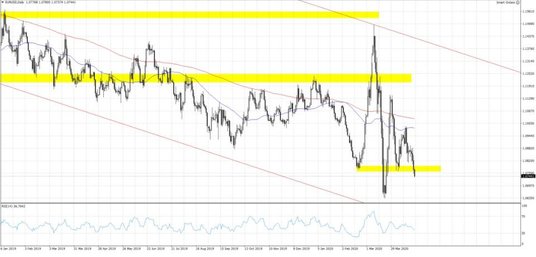 Choć trudno wcześniej było wyobrazić sobie wskaźniki koniunktury na poziomie 10 pkt., w czasach kryzysu finansowego sprzed 12 lat osunęły się do 30 pkt., podczas gdy neutralna wartość to 50 pkt., to jednak oczywistym jest, że zdecydowana większość ankietowanych firm odczuwa pogorszenie koniunktury wobec tej sprzed miesiąca, szczególnie w usługach. Jest to związane z zamrożeniem aktywności. Nie bez przyczyny uważane są one za najlepsze źródło informacji nt. aktywności gospodarczej. Równie szybko jednak jak nastąpiło załamanie może przyjść i powrót wskaźnika powyżej granicznej wartości 50 pkt. wraz z tym jak rozpocznie się odmrażanie gospodarek, a przedsiębiorcy będą odczuwali poprawę wobec sytuacji sprzed miesiąca. Z tego powodu publikacja samych wskaźników nie spowodowała większej wyprzedaży na rynku, który oczekuje teraz stopniowego odbudowywania aktywności. Na uwagę zasługuje jednak fakt, że choć katastrofalne są również dane z USA, wskaźniki zarówno dla przemysłu jak i sektora usługowego wypadły słabiej od prognoz, to jednak lepiej niż w porównaniu do strefy euro. Indeks Composite będący średnią ważoną koniunktury w usługach oraz przemyśle spadł do historycznego minimum na poziomie 27.4 pkt. z 40.9 pkt. w marcu. Dla porównania analogiczny wskaźnik w strefie euro zanotował spadek do 13.5 pkt. z 29.7 pkt. przed miesiącem. Dane te potwierdzają, że mimo wszystko amerykańska gospodarka radzi sobie nieco lepiej z pandemią koronawirusa niż Europa, co jest argumentem na korzyść amerykańskiej waluty. Dziś w centrum uwagi znajdzie się odczyt niemieckiego instytutu Ifo, uważany za najlepsze źródło informacji nt. koniunktury u naszego zachodniego partnera handlowego.