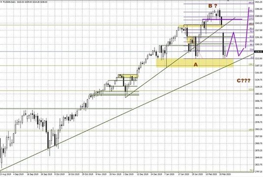 Na wykresie poniżej mamy ciekawy schemat dla indeksu S&P500. Wczorajsze spadki zatrzymały się przy strefie wsparcia w postaci tegorocznego dołka przy 3112 pkt. Zakładając, że ten nie zostanie dzisiaj wieczorem wyraźnie naruszony (chociaż ważna jest cała strefa 3180-3112 pkt.), kolejne dni mogą przynieść próbę odbicia, która będzie ograniczana przez wczorajszą lukę spadkową (widoczną od 3306 pkt w górę). Interesującym aspektem jest oznaczenie struktury od początku roku jako A-B-C, co mogłoby sugerować, że teraz jesteśmy już w tej ostatniej fali, która niestety bywa najdłuższa i najbardziej wyczerpująca. O tym przekonamy się najpewniej w ciągu 2 tygodni, kiedy być może rynki będą ponownie sprawdzać obecne minima. Wtedy, albo wracamy do wcześniejszego, długoterminowego trendu wzrostowego pchani przez wspomnianą fiskalno-monetarną „pompę decydentów", albo zaczynamy rozwijać rozbudowaną strukturę fali C.