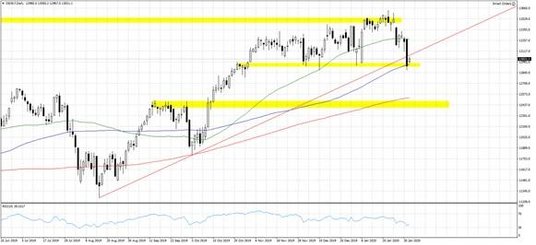 Dziś jednak notowania kontraktu terminowego na S&P 500 odbijają w kierunku 3250 pkt. w czym pomagają działania stymulujące podjęte przez chińskie władze. Tamtejsze indeksy po zakończeniu obchodów chińskiego Nowego Roku zaliczyły dziś 9% spadki. Luzowanie polityki monetarnej w Państwie Środka ma na celu nie tylko zapewnienie odpowiedniego wsparcia gospodarce, ale również opanowanie sytuacji na rynkach akcyjnych. Liczba zarażonych wzrosła już do 17 tys., a ofiar przekroczyła 360. Globalne konsekwencje w dalszym ciągu są trudne do oszacowania, przez co ryzyka dla cen akcji w dalszym ciągu mogą być asymetryczne w dół. W sytuacji gdyby dzisiejsze otwarcie sesji w USA przyniosło dalszy odwrót od akcji i pogłębienie piątkowych minimów, otworzyłaby się droga w kierunku 3150 pkt. Notowania DAXa znalazły się z kolei w piątek w okolicy 12900 pkt., a dalsza presja na bardziej ryzykowne aktywa może spychać niemiecki indeks w kierunku 12500 pkt.