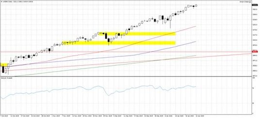 Obawy związane z rozprzestrzenianiem się chińskiego wirusa spowodowały, że sesja azjatycka przebiegła dzisiaj na czerwono. Niemal 1% na wartości stracił japoński Nikkei, Hang Seng osunął się zaś o prawie 2%. Kapitał płynął natomiast w stronę japońskiego jena. Pretekstem do wyprzedaży były działania chińskich władz, które w odpowiedzi na rosnące ryzyko wystąpienia epidemii zdecydowały się na zawieszenie transportu publicznego w 11 milionowym Wuhan, zalecając jednocześnie mieszkańcom, aby nie opuszczali miasta. Przełożenie na kontrakty terminowe opierające się o główne amerykańskie i europejskie indeksy pozostaje bardziej umiarkowane, choć widoczna jest lekka przewaga niedźwiedzi. Inwestorzy wciąż skupieni są na trwającym za oceanem sezonie wyników, monitorując również wciąż kwestie handlowe, gdzie po podpisaniu porozumienia z Chinami uwaga amerykańskiej administracji zaczyna coraz bardziej kierować się na Europę.