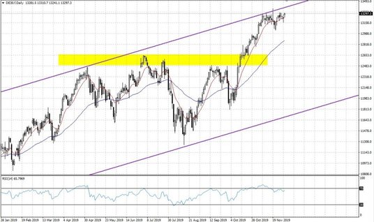 Rządowy indeks PMI dla sektora przemysłu zanotował wzrosty z 49.3 pkt. do 50.2 pkt., po raz pierwszy od kwietnia przebijając barierę 50 pkt. Pozytywnie zaskoczył również odczyt Caixin dla powyższego sektora. Z kolei rządowy wskaźnik dla usług wzrósł z 52.8 pkt. do 54.4 pkt., co jest najwyższym poziomem od marca. Choć ciężko mówić jeszcze o istotnym odbiciu, to jednak publikacja dzisiejszych i sobotnich danych nieco zmniejsza obawy dotyczące skali spowolnienia gospodarki Państwa Środka. W odpowiedzi na powyższe odczyty sesja azjatycka przebiegała pod znakiem dominacji kupujących. Bardziej mieszane nastroje panują natomiast na Starym Kontynencie, co wiąże się wzrostem ryzyka politycznego po tym jak na nowe władze SPD niespodziewanie został wybrany duet Saskii Esken i Norbert Walter-Borjans, przegraną zanotował z kolei obecny minister finansów Olaf Scholz. Oboje dali się poznać jako przeciwnicy prowadzonej przez Angelę Merkel polityki, w szczególności w sferze wielkości rządowych wydatków. Tym samym zwiększa się ryzyko rozpadu rządzącej w Niemczech wielkiej koalicji. Największą uwagę rynek powinien jednak skupiać na dalszym przebiegu konfliktu handlowego. Bieżące wieści z tego frontu mają nieco mniej optymistyczną wymowę. Państwo Środka w odwecie za podpisanie przez amerykańskiego prezydenta ustawy wspierającej protestujących w Hong Kongu zdecydowało wprowadzić sankcje względem niektórych organizacji pozarządowych, zajmujących się m.in. ochroną praw człowieka, zapowiadając że w razie potrzeby władze gotowe są na podjęcie dalszych kroków. Tymczasem chiński dziennik Global Times doniósł, że Pekin zainteresowany jest przede wszystkim cofnięciem dotychczas wprowadzonych ceł, a nie jedynie odwołaniem kolejnych.