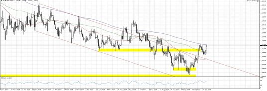 Na uwagę zasługuje jeszcze wynik wczorajszego posiedzenia Banku Kanady. O ile poziom stóp procentowych został utrzymany na niezmienionym poziomie, to jednak obniżenie prognoz wzrostu gospodarczego, które otworzyło szerszą dyskusją dotyczącą obniżek stóp procentowych, zostało mocno gołębio odebrane przez rynek i przełożyło się na wzrosty notowań USDCADa w kierunku 1.32. Dolar kanadyjski powinien zatem obecnie w większym stopniu reagować na dane spływające z gospodarki, bowiem mogą one determinować oczekiwania związane z dalszą ścieżką stóp procentowych. Dzisiejsze posiedzenie Banku Japonii przeszło całkowicie bez echa, a zmiana forward guidance i gotowość do utrzymania obecnego kształtu polityki monetarnej tak długo jak będzie to konieczne była spodziewane. Na rynku walutowym pozytywnie wyróżniają się notowania dolara nowozelandzkiego, który zyskuje w efekcie spadku oczekiwań na cięcie stóp podczas listopadowego posiedzenia. W kontekście negocjacji handlowych rynek teraz czeka na możliwą datę podpisania częściowego amerykańsko-chińskiego porozumienia handlowego, bowiem szczyt w Chile w połowie listopada ze względu na trwające protesty został odwołany. Opublikowane po zamknięciu sesji wyniki Apple zostały dobrze odebrane, niemniej jednak nastroje mogą chłodzić dzisiejsze słabsze od prognoz dane PMI z Chin.