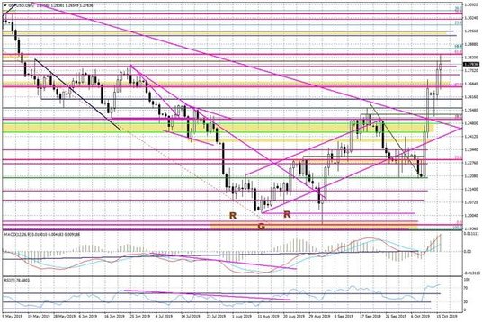 Teoretycznie nadal nie wiemy wiele. Nie przeszkodziło to jednak w osiągnięciu przez funta nowych maksimów – dla GBPUSD to rejon 1,2838, pokrywający się dodatkowo z 38,2 proc. zniesieniem Fibo w okolicach 1,2830, przez co dość ciekawy ze średnioterminowego punktu widzenia. Zmienność na „kablu" jest dzisiaj ogromna, ale tym razem zwróćmy uwagę na to, że rynek nie reaguje już tak asymetrycznie jak wcześniej – negatywna informacja jest w stanie równie szybko zbić kurs w dół, podobnie jak pozytywna podbić go w górę. To oznacza, że być może warto się dłużej pochylić nad poziomem 1,2830. Dlaczego? Jeżeli założymy, że Boris Johnson rzeczywiście ma już deal'a z Brukselą, to przed nami kluczowy i być może najtrudniejszy wątek przeprowadzenia całego porozumienia przez brytyjski parlament – premier May poległa na swojej umowie kilkukrotnie. Sprzeczne plotki nt. stanowiska północnoirlandzkich unionistów z DUP w temacie poparcia dla planu Borisa Johnsona, to dowód na to, że polityczna stawka w grze pozostaje wysoka. Co dalej? Jutro zaczyna się szczyt UE, albo nowa umowa Brexitowa trafi na główną agendę dyskusji, albo nic z tego i zobaczymy mocniejszą i dynamiczną korektę funta.... Warto też pamiętać o tym, że nie tylko stanowisko DUP jest tu kluczowe, bo Partia Konserwatywna od dawna nie jest już monolitem i nie jest jasne, jak do nowej umowy ws. Brexitu podejdzie proeuropejska frakcja.