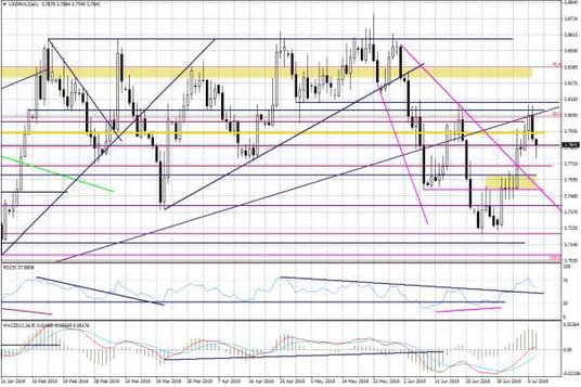 Na wykresie USDPLN po wczorajszym cofnięciu w dół widać, że będąca oporem linia trendu przy 3,8050 nadal jest respektowana. Niezależnie od rysującej się w tym momencie świecy doji na dziennym ujęciu, korekta spadkowa może być wydłużona na co wskazuje oscylator RSI9, gdzie możemy być świadkami tzw. ruchu powrotnego. Ważny rejon wsparcia to okolice 3,7500-3,7620.