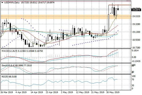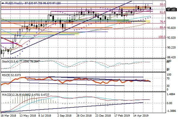 Wątek Meksyku podbija też notowania na nowojorskiej giełdzie, w połączeniu ze spekulacjami wokół bardziej „gołębiej" polityki FED. Te jednak zdaje się, że były ostatnio nieco na „wyrost" i wczoraj dolar już nie tracił, a odbijał. Dobrze to widać po zachowaniu się koszyka dolara FUSD, który obronił wsparcie przy 96,85 pkt., chociaż chwilowo je naruszył (minimum 96,64 pkt.). Wsparciem stał się odczyt indeksu ISM dla usług, który przykrył słabe dane ADP. Zresztą oba subindeksy zatrudnienia w ISM (przemysłowym i usługowym) wypadły w maju lepiej, co zmniejsza ryzyko rozczarowania jutrzejszymi danymi Departamentu Pracy USA.