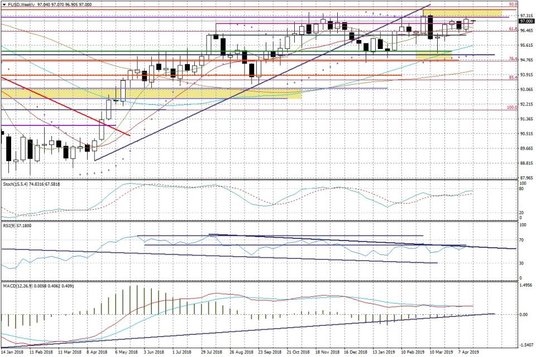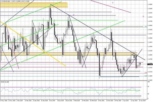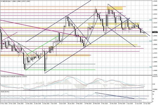 Walutą, gdzie duży wpływ nadal ma polityka, pozostaje brytyjski funt. W tygodniu przed Świętami większe znaczenie od publikacji makro miały przecieki, jakoby rozmowy torysów z laburzystami w temacie Brexitu utknęły w martwym punkcie. Dzisiaj do pracy po świątecznej przerwie powraca Izba Gmin, co może przynieść nowe plotki nt. potencjalnych scenariuszy. Patrząc na sondaże przed wyborami do Parlamentu Europejskiego widać, że „ślimaczący się" Brexit szkodzi obecnym elitom (najbardziej torysom), a premiuje przypadkowe wybory (nowa Partia Brexitu ma największe poparcie). To może sprawić, że w Partii Konserwatywnej będzie narastać presja, aby zgodzić się na kompromis z laburzystami ws. Brexitu, lub usunąć premier May ze stanowiska. Na razie na dziennym układzie GBPUSD widać, że wciąż respektowana jest spadkowa linia trendu, a wsparcie można wyznaczyć w okolicach dołka z 11 marca przy 1,2959.