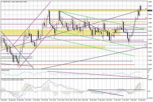 Kolejne godziny przynoszą cofnięcie w dół. Patrząc czysto technicznie zejście poniżej strefy 3,8325-3,8400 może dać szanse na zejście w okolice wczorajszego dołka przy 3,8114. Niemniej fundamentalnie potrzebna będzie globalna zmiana wobec dolara wyrażona chociażby w zachowaniu się EURUSD.