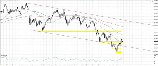Nastrojów również nie poprawia przedłużający się government shutdown, który ma coraz bardziej negatywny wpływ na gospodarkę i nie widać większych szans na zakończenie go w niedługim czasie. Co prawda w dniu jutrzejszym w senacie zaplanowane jest głosowanie, które otwierałoby drogę do otwarcia części urzędów federalnych, niemniej jednak spór dotyczący budowy muru na granicy z Meksykiem pomiędzy Trumpem a Demokratami pozostaje zażarty i nie daje większych nadziei na zakończenie go w niedługim czasie. W kontekście rozmów handlowych główny doradca ekonomiczny Donalda Trumpa Lawrence Kudlow zwrócił uwagę, że przyszłotygodniowe rozmowy będą kluczowe dla stosunków pomiędzy dwoma mocarstwami. W perspektywie do końca tygodnia trudno zatem znaleźć elementy, które byłyby w stanie zdecydowanie zmienić sentyment wobec ryzykownych aktywów. Zarówno S&P 500 jak i niemiecki Dax znajdują się tuż powyżej wsparć odpowiednio na poziomie 2600 i 11000 pkt.