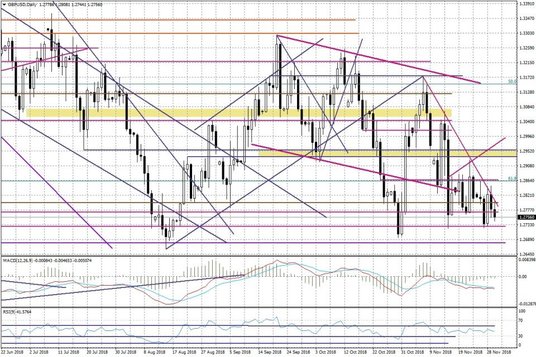 Na wykresie EURUSD widać, że zwyżka z ostatnich dwóch dni nie zdołała doprowadzić do wyraźniejszego naruszenia rejonu 1,14, ale obserwowana dzisiaj korekta jest płytka. Rynek na razie respektuje lokalne wsparcie przy 1,1365. W nieco szerszym ujęciu widać, że nadal mamy szanse na rozegranie formacji odwróconej RGR. Linia szyi przebiega przy 1,1440. Rynek potrzebuje fundamentalnego katalizatora do ruchu. Czy będą nim pozytywne informacje po szczycie G-20? Jeżeli spekulacje WSJ o możliwości wstrzymania nawet o kilka miesięcy planów nałożenia kolejnych ceł na Chiny, znajdą swoje potwierdzenie, to będzie to już bardzo dobry „news". Zwłaszcza, że zmniejszy też ryzyka makroekonomiczne dla samych Chin, które widać w opublikowanych dzisiaj danych PMI.