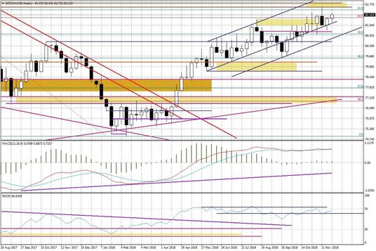 Koszyk dolara BOSSA USD pozostaje ponad poziomem 82,0 pkt. i dopóki tak będzie, to większe szanse będą w testowaniu szczytu przy 82,58 pkt. sprzed 2 tygodni. Niemniej widoczne na ujęciu tygodniowym średnioterminowe, negatywne dywergencje powodują, że cały czas należy być dość „elastycznym".