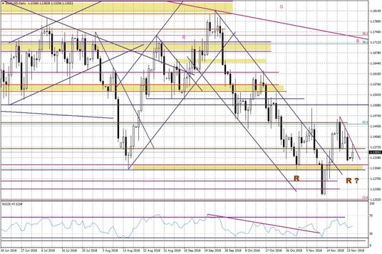 Na wykresie EURUSD widać, że pierwsze podejście pod linię spadkową trendu poprowadzoną od szczytu z 20 listopada nie było udane. Na wykresie widać jednak dość ciekawe oznaczenia dla odwróconej formacji RGR. Jej elementy mogłyby zaistnieć, jeżeli pojawiłyby się kolejne spekulacje wokół Włoch, a dolar mógłby się rozczarować informacjami z FED, jakie są planowane na środę.