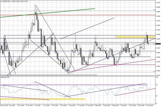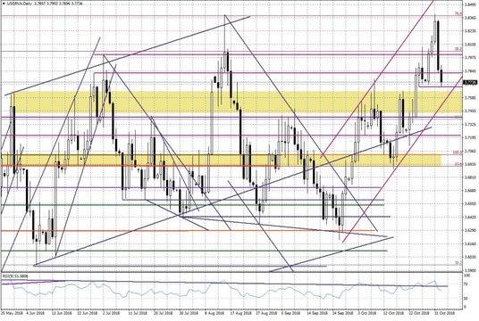 Na wykresie EURPLN widać, że ważnym poziomem jest 4,32. Powrót rynku ponad 4,32, co właśnie ma miejsce, to sygnał, że możemy ponownie testować okolice 4,33-4,34. Z kolei dla USDPLN wsparcie to rejon 3,77 bazujący m.in. na minimum świecy z 25 października, a rynek może wykonać ruch powrotny do 3,80. Wydaje się, że jest jeszcze zbyt wcześnie, aby ostatnie spadku na EURPLN i USDPLN uznać za sygnał zbliżającego się większego przesilenia. Niemniej, jak pokazuje chociażby układ na koszyku BOSSA PLN (odbicie od ważnej strefy wsparcia 89,30-89,60 pkt.), rynek ma prawo do korekty. Ten sam wykres każe się jednak zastanowić, czy nie mamy do czynienia z tzw. ruchem powrotnym, gdyż ułożenia tygodniowych wskaźników są pro-spadkowe.