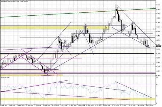 Notowania EURPLN przetestowały dzisiaj okolice 4,25. Poniższy dzienny wykres sugeruje, że trudno może być o zejście niżej w krótkim terminie. Najpewniej pozostaniemy w przedziale 4,25-4,27.