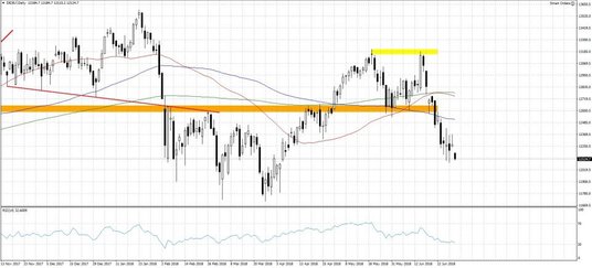 Na rynku walutowym dolar nieznaczne zyskuje na wartości, a notowania EURUSD schodzą w kierunku 1.1650. Sytuacji euro oraz nastojów rynkowych nie poprawia utrzymujący się konflikt w niemieckim rządzie. Mimo mieszanego sentymentu na rynku akcyjnym notowania USDJPY utrzymują się powyżej 110.60. Słabość jena wynika dziś z silniejszego od oczekiwań spadku indeksu Tanken dla przemysłu, który w II kw. obniżył się do 21 pkt. z 24 pkt. w pierwszych trzech miesiącach roku i oczekiwanych 22 pkt. Funt szterling z kolei pozostaje poniżej 1.32 wobec USD. Wśród walut emerging markets wyróżnia się meksykańskie peso, które początkowo zyskiwało na wartości po tym jak Andres Manuel Lopez Obrador z dużą przewagą wygrał wybory prezydenckie. Kandydat lewicy odniósł zwycięstwo dzięki populistycznym hasłom, dlatego też aprecjacja MXNa nie trwała długo.