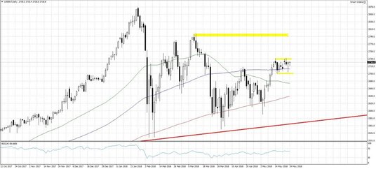 Minutki całkowicie wpisały się w oczekiwania na czerwcową podwyżkę stóp procentowych, niemniej jednak nie przemawiają za bardziej agresywnymi podwyżkami stóp procentowych na skutek wzrostu inflacji napędzanej wyższymi cenami ropy. W efekcie w średnim terminie nie powinny dawać wsparcia amerykańskiej walucie, która od miesiąca systematycznie zyskuje na wartości. Po publikacji dokumentu notowania EURUSD wróciły powyżej 1.17 i tam pozostają. O ile sama publikacja protokołu poprawiła sentyment na rynku akcyjnym, to jednak szybko ponownie popsuły go działania Donalda Trumpa. Zapowiedział on śledztwo dotyczące importu aut, co ponownie zrodziło obawy o eskalację wojny handlowej i nałożenie ceł na import aut z Azji oraz Europy, w efekcie ciążąc na sentymencie rynkowym. Notowania USDJPY dalej spadają i znajdują się już poniżej 110. Patrząc jednak na notowania kontraktu terminowego na S&P 500, to cały czas znajdują się one w dwutygodniowej konsolidacji i mimo zapowiedzianego przez Trumpa śledztwa, niepewnego spotkania z Kim Dzong Unem czy niekorzystnego rozwoju sytuacji politycznej we Włoszech, perspektywa wciąż akomodacyjnej polityki monetarnej cały czas stwarza szanse na dalszą wędrówkę amerykańskich indeksów na północ.