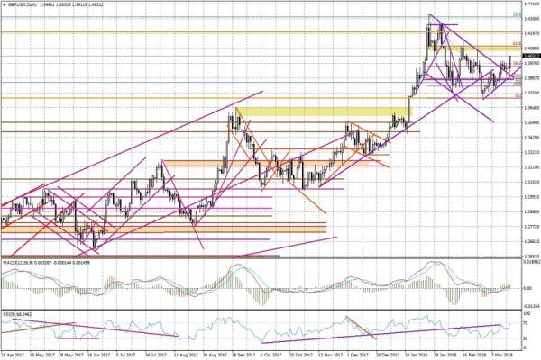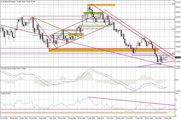 Przeanalizujmy dwa powyższe wykresy. Pierwszy to tygodniowe ujęcie koszyka dolara. Ubiegły tydzień był dobry (udało się wybronić wsparcie przy 75,95 pkt.), ale i też do żadnego przełomu nie doszło. Nadal obowiązuje opór przy 76,93 pkt. (minimum z września ub.r.), który nawet nie był testowany. W tym tygodniu zbiega się on z linią trendu spadkowego rysowaną od grudnia 2016 r., stąd też przed nami dość ważny okres... Na plus można uznać zachowanie się tygodniowych wskaźników – MACD może wygenerować sygnał kupna, jeżeli nie dojdzie do załamania się notowań w najbliższych dniach. Drugi wykres to dzienne ujęcie GBP/USD. Funt zeszłym tygodniu był silny, a dzisiejsze wybicie ponad barierę 1,40 potwierdza tą tendencję. Przed nami jednak szereg ważnych publikacji. Poza wspomnianym już szczytem UE w czwartek, tego samego dnia mamy jeszcze kluczowy komunikat Banku Anglii, która może zaważyć na oczekiwaniach dotyczących majowej podwyżki stóp (są wysokie), a już jutro poznamy dane nt. inflacji CPI i PPI za luty, a w środę dane z rynku pracy. Duża zmienność w tym tygodniu wydaje się być gwarantowana... Na razie najbliższy ważny opór dla GBP/USD to okolice 1,4065-1,4105, gdzie przebiega m.in. zniesienie 61,8 proc. fali spadkowej z lutego. Na zakończenie zerknijmy na EUR/USD, który w piątek wyłamał ważne wsparcie przy 1,2295. Kontynuacji wyraźnej zniżki jednak nie ma, nie doszło nawet do przetestowania wsparcia przy 1,2245. Jeżeli ceny łatwo powrócą ponad strefę 1,2295-1,2322, to spadną szanse na spadek w stronę wsparcia przy 1,2154 (dołek z 1 marca, ale i też ograniczenie w postaci linii trendu wzrostowego rysowanej od dołka z listopada ub.r.).