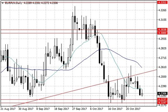 Dzisiejszy poranny odczyt indeksu PMI dla przemysłu Polski za październik, który okazał się niższy od oczekiwań (53,4 pkt. wobec spodziewanych 54 pkt.) nie zdołał istotnie zachwiać notowaniami polskiego złotego. Ze względu na wczorajsze święto w Polsce, aktywność inwestorów na krajowym rynku walutowym jest ograniczona, co sprawia, że złoty pozostaje pod dużym wpływem informacji z zagranicy i towarzyszących im ruchów notowań głównych par walutowych.