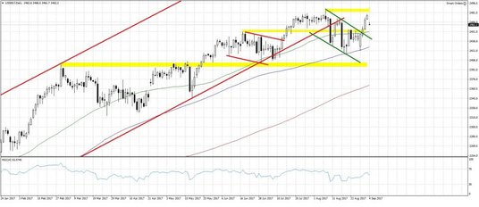 Widać odwrót w kierunku bezpiecznych przystani. Na rynku walutowym najmocniejszy jest frank szwajcarski oraz japoński jen. Notowania USDCHF spadają do 0.9580, a USDJPY do 109.40. Złoto natomiast przebiło 1337 USD, czyli szczyty osiągnięte podczas nocy po wyborach prezydenckich w USA. Indeksy giełdowe znajdują się pod dużą presją. Kontrakt terminowy na S&P 500 spada o niespełna 20 pkt. i znajduje się nieco powyżej 2460 pkt. Dziś jednak w USA jest dzień wolny i pod nieobecność amerykańskich inwestorów na większe ruchy na rynku są małe szanse. Z tego względu rynkowa reakcja na wydarzenia w Korei Północnej może rozciągnąć się na dwa dni. W ubiegłym tygodniu po tym jak Korea Północna wystrzeliła w kierunku Japonii rakietę, straty odrobione zostały w ciągu jednej sesji. Teraz jednak rynek może czekać na jutrzejsze pojawienie się Amerykanów. W kwestii dalszej reakcji kluczowe będzie stanowisko Donalda Trumpa i to czy odpowie on na ostatnie wydarzenia bardziej zdecydowanie. Ostatnie komunikaty wysyłane przez amerykańską administrację wskazują jednak, że będzie ona dążyła do jeszcze większej izolacji Korei Północnej, a możliwa odpowiedź militarna jest w dalszym ciągu bardzo mało prawdopodobna. Taki rozwój wydarzeń powinien sprzyjać stopniowemu powrotowi wzrostów na rynkach, niemniej jednaj te pozostawać będą jeszcze bardzo wrażliwe na komunikaty Donalda Trumpa. Dla S&P 500 pierwsze wsparcia to obecnie rejon 2450 pkt.