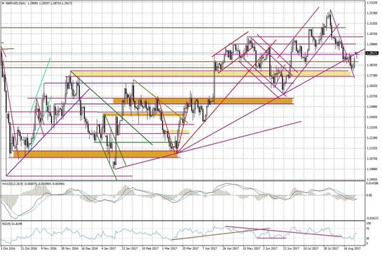 Na dziennym wykresie GBPUSD widać, że mocujemy się z ważną linią trendu wzrostowego, jaka została złamana w zeszłym tygodniu. Obecny ruch można zakwalifikować jako powrotny. Zastanawiające jest jedynie zachowanie się dziennego MACD, który wygenerował sygnał kupna.