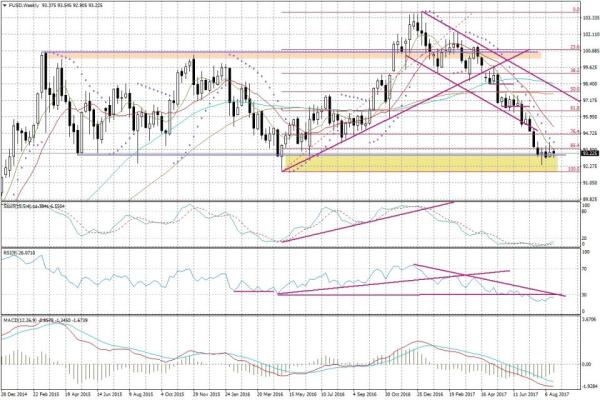 Technicznie sytuacja na koszyku dolara FUSD pozostaje bez większych zmian, co obrazuje poniższy wykres. Widać jednak, że od ponad 3 tygodni mamy konsolidację, która może być zapowiedzią większego ruchu. Na razie jednak wskaźnik RSI9 nie zdołał naruszyć ważnych poziomów oporu.