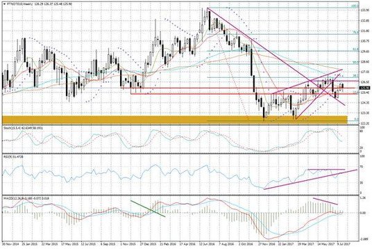 Słabość dolara obserwowana po informacjach z FED sprawiła, że przetestowany został rejon mocnego wsparcia przy 93 pkt. (fioletowa linia), jaki był wskazywany w Tygodniku FX. To kluczowy poziom oparty o minima z 2015 i 2016 r., od którego może wiele zależeć. Wydaje się, że nie należy przekreślać scenariusza możliwego odbicia się dolara w najbliższych miesiącach, chociaż wcześniej rynek może budować kilkutygodniową bazę (w sierpniu?) pod taki ruch.