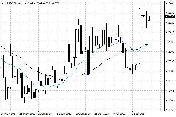 Spokojne ruchy cenowe na wykresie indeksu polskiego złotego wynikają m.in. z niemal pustego kalendarza danych makro w Polsce na początku bieżącego tygodnia. Wczoraj pojawiły się jedynie dane dotyczące stopy bezrobocia, które okazały się zgodne z oczekiwaniami (stopa bezrobocia w czerwcu znalazła się na poziomie 7,1%). Uspokoiła się nieco także sytuacja polityczna w Polsce – aczkolwiek nie wiadomo, czy trwale. Wczoraj w swoim raporcie agencja ratingowa Moody's oceniła m.in., że reforma sądownictwa zagraża praworządności w Polsce, a spór z Unią Europejską może odstraszać niektórych inwestorów od naszego kraju.