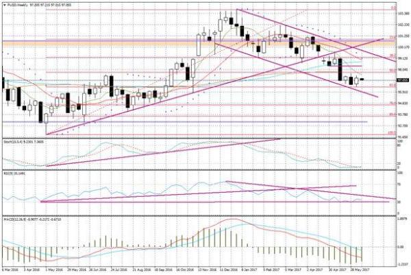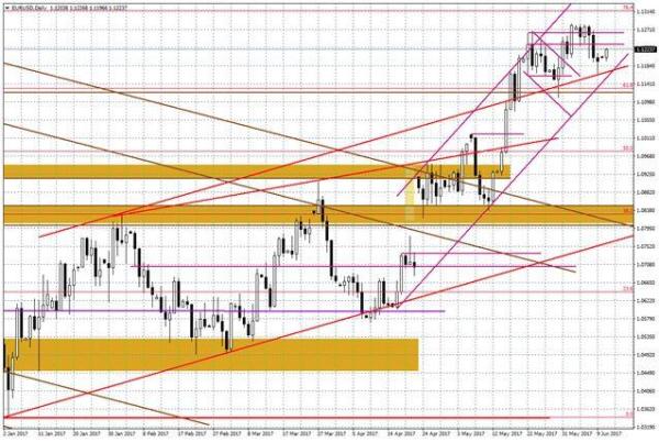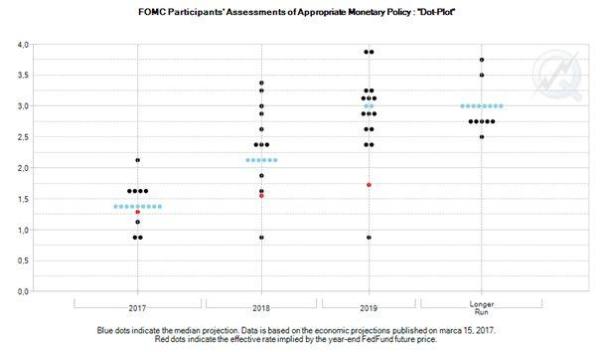 : Poniedziałek jest ubogi w istotne publikacje makro, rynki tym samym czekają już na środę, kiedy to poznamy najprawdopodobniej decyzję o kolejnej podwyżce stóp procentowych ze strony FED, ale nie to będzie kluczowe, tylko towarzyszący jej komunikat, oraz projekcje makro. Czerwcowy ruch inwestorzy wycenili już dawno, a mimo tego dolar był w ostatnich tygodniach słaby. To pochodna mieszanych odczytów makro, utrzymujących się politycznych problemów Donalda Trumpa, które mogą rzutować na tempo legislacji w Kongresie dotyczące proponowanych przez niego reform, co w efekcie sprawiło, że rynek przestał wierzyć w przyszłe projekcje FED dotyczące poziomu stóp procentowych. Dobrze to widać na poniższym wykresie – czerwone kropki (wycena na bazie kontraktów terminowych) wyraźnie odbiegają od mediany (niebieskie kropki). Rozwiązania są dwa – albo FED zrewiduje nieco w dół swoje projekcje w najbliższą środę (mało prawdopodobne), albo rynek będzie musiał „podciągnąć" się pod FED, w czym być może pomoże interpretacja przekazu, jaki poznamy w środę. Rozwiązanie trzecie, czyli dalsze utrzymywanie się dotychczasowych dysproporcji też może mieć miejsce, ale raczej nie będzie utrzymywać się przez kolejne kilka miesięcy. Zwróćmy uwagę na to, że rynek nie wierzy nawet w to, że FED mógłby podnieść w tym roku stopy procentowe po raz trzeci! Oczywiście pośrednio jest w tym też wynik obaw dotyczących redukcji sumy bilansowej FED, który to proces według zapowiedzi powinien rozpocząć się jeszcze w tym roku. Niemniej wielokrotnie podkreślano, że będzie on odbywać się stopniowo i tym samym nie wpłynie znacząco na projekcje FED.